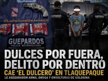 Detienen en Tlaquepaque a “El Dulcero”, quien presuntamente vendía droga en envolturas de golosinas. Le aseguraron arma, cartuchos y diversas dosis de droga