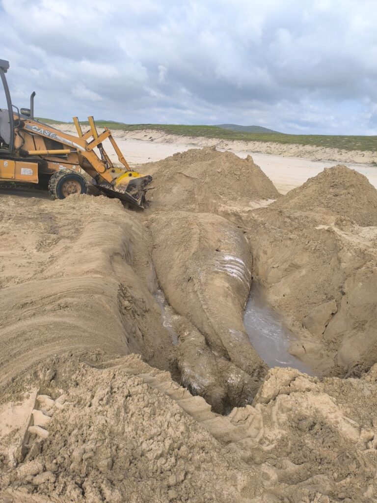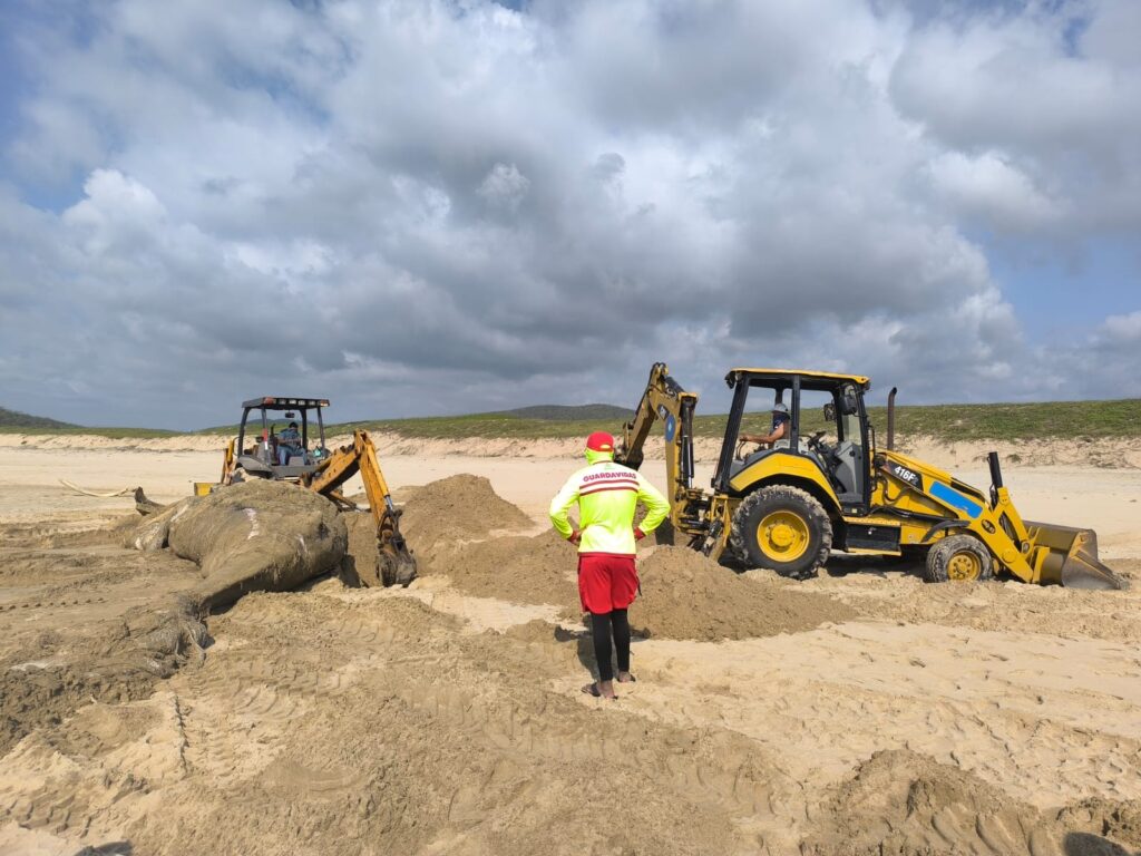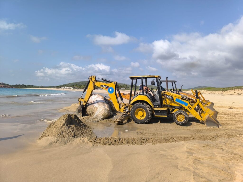 Este sábado, la Unidad Estatal de Protección Civil y Bomberos de Jalisco, en coordinación con instancias ambientales federales, llevó a cabo los trabajos para el entierro del cuerpo, procedimiento que se realizó con apoyo de maquinaria pesada y siguiendo los protocolos ambientales establecidos para este tipo de casos.