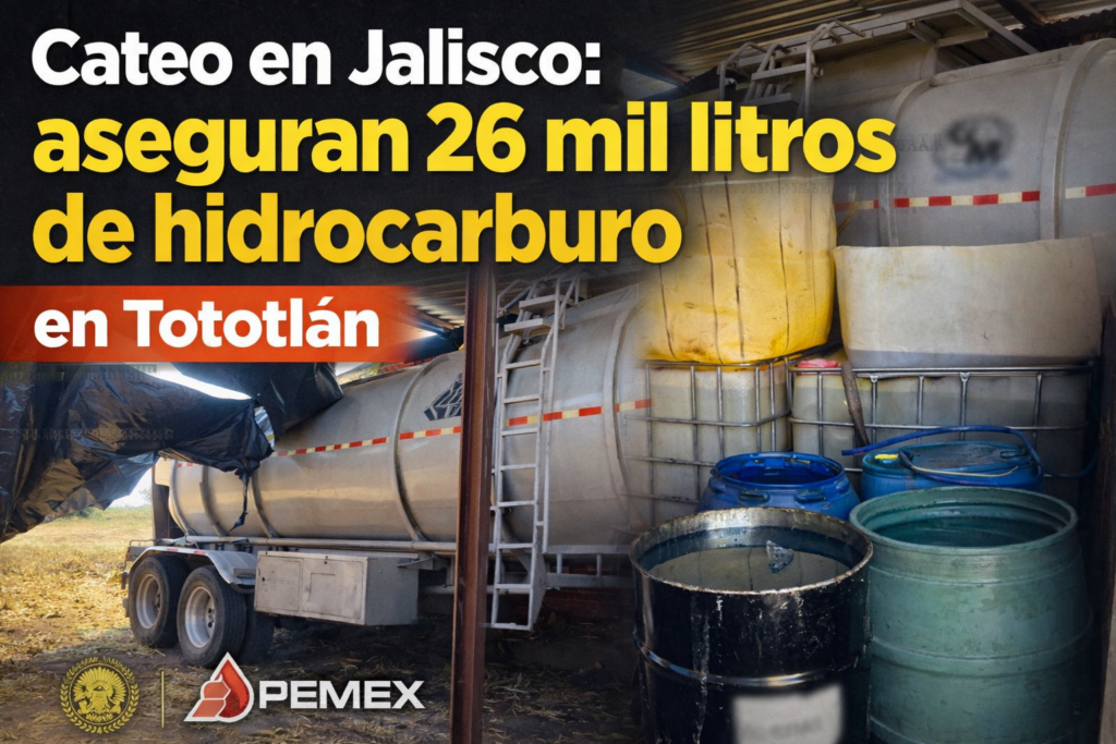 Un operativo federal permitió el aseguramiento de más de 26 mil litros de hidrocarburo y la localización de cuatro tomas clandestinas en el municipio de Tototlán, Jalisco, informó la Fiscalía General de la República (FGR).