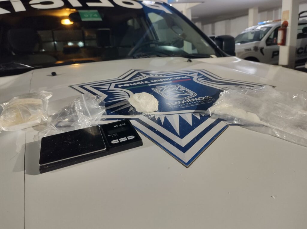 Tras marcarle el alto, los policías realizaron una revisión precautoria conforme al protocolo. En la inspección encontraron una báscula gramera, varias bolsas tipo Ziploc y dos envoltorios con una sustancia granulada con características similares a la droga conocida como cristal.