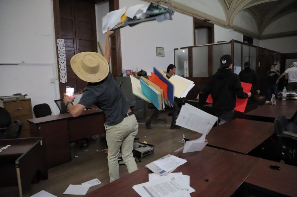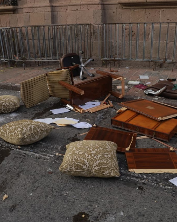 Una vez dentro, los manifestantes rompieron mobiliario, arrojaron objetos desde los balcones y lanzaron bombas molotov, lo que provocó incendios en oficinas gubernamentales. También se registraron pintas y destrozos en distintas áreas del recinto.