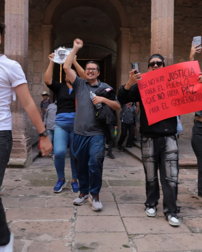 De acuerdo con reportes locales, la movilización comenzó alrededor de las 16:00 horas en el Jardín Morelos, desde donde decenas de personas marcharon hacia el Palacio de Gobierno. El contingente avanzó entre consignas de “¡Justicia para Manzo!” y pancartas que exigían el esclarecimiento del homicidio del edil, ocurrido el pasado 1 de noviembre, durante las celebraciones del Día de Muertos.