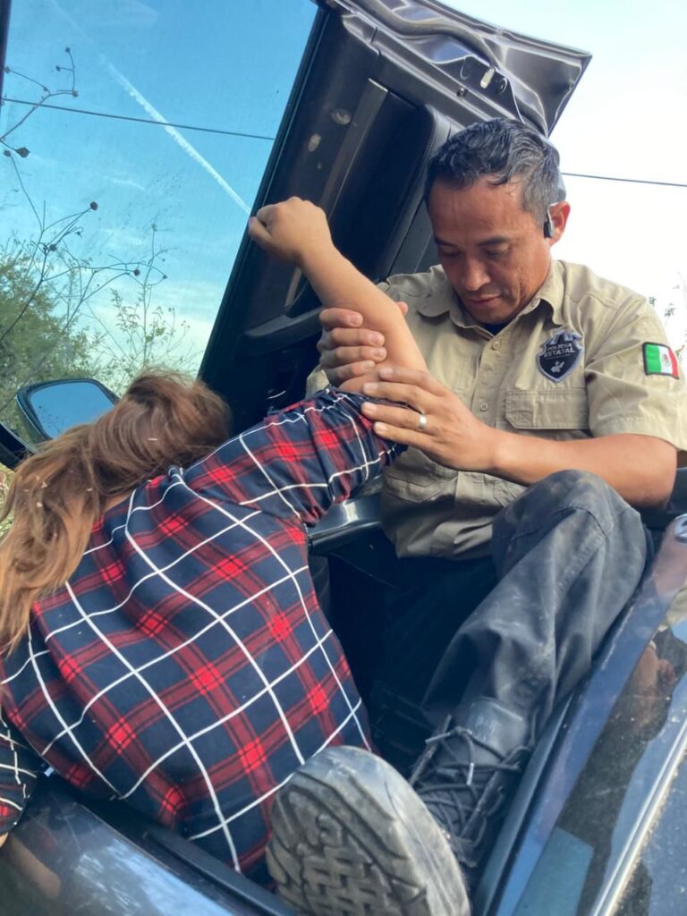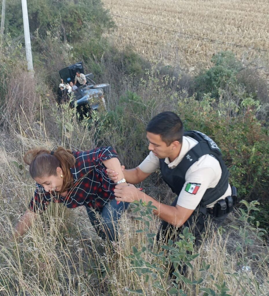 Elementos de la Policía Estatal Turística y la Policía de Caminos rescataron a una pareja que había volcado su camioneta en un tramo de la Carretera de Tuxcueca a Mazamitla.