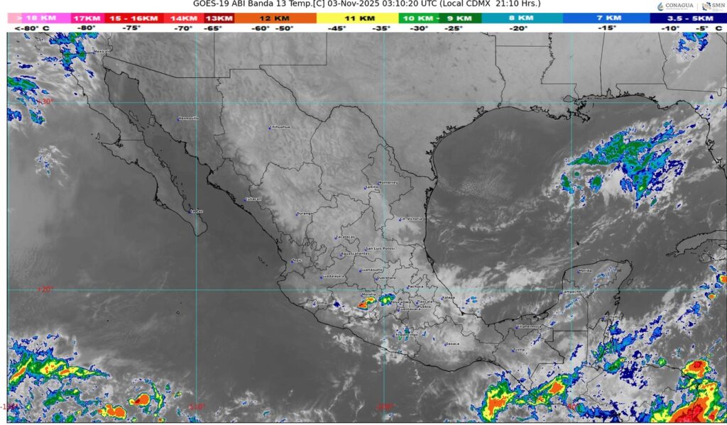Aunque el sistema frontal se mantendrá más activo sobre el oriente y sureste del territorio nacional, en el occidente —particularmente en Jalisco, Colima y Michoacán— se prevén lluvias aisladas y ligeras, así como temperaturas mínimas de 0 a 5 °C en zonas serranas, especialmente en municipios de la Región Altos, el sur y la zona Norte del estado.