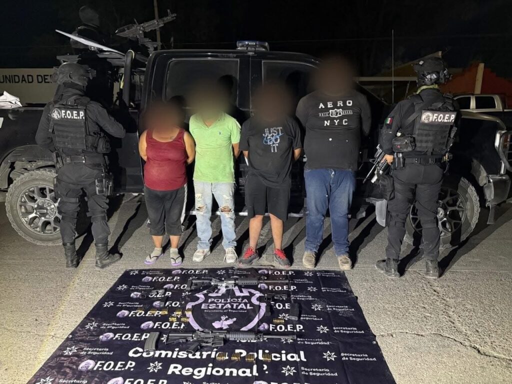 Los detenidos fueron identificados como Juan “N”, de 38 años, presunto encargado de cobro de piso; su pareja Araceli “N”, de 35, señalada como coordinadora de venta de drogas; su hijo David “N”, de 19, presunto sicario; y Arturo “N”, de 25, sobrino de Juan, también vinculado con ejecuciones.