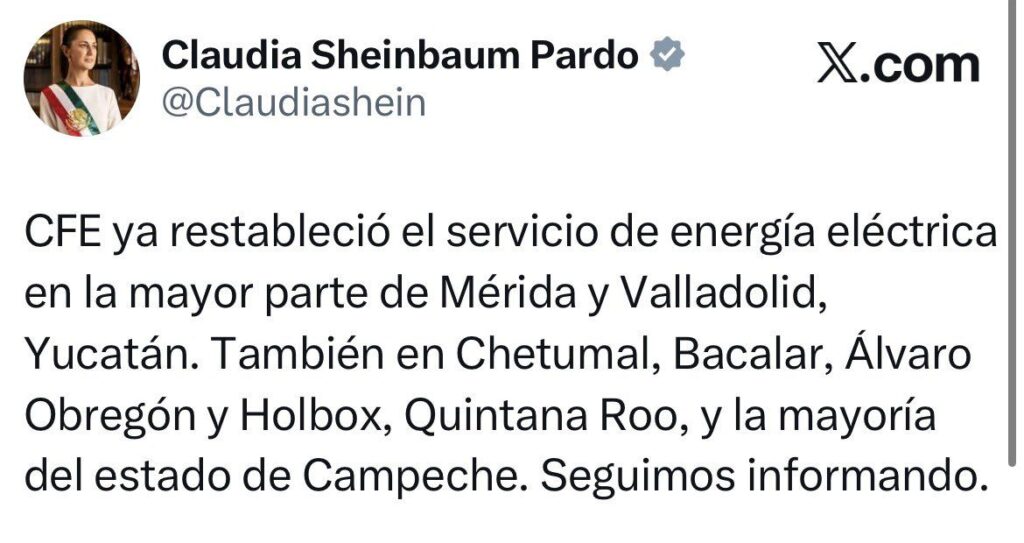 La gobernadora de Quintana Roo, Mara Lezama, informó en su cuenta de X que se solicitó a la Comisión Federal de Electricidad (CFE) un reporte oficial sobre la causa del apagón, al tiempo que aseguró que los equipos de emergencia permanecen en operación.