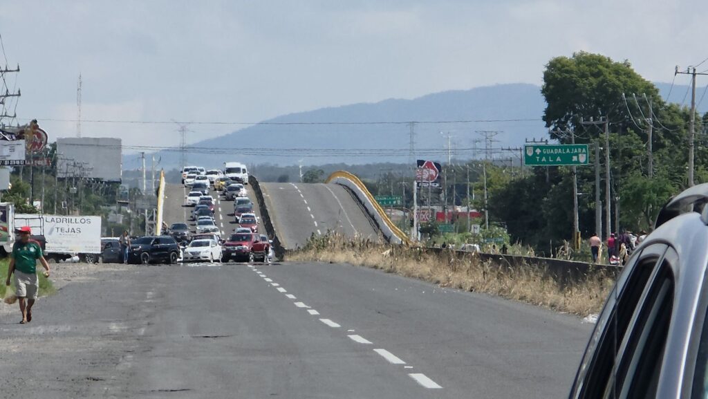Tala, Jalisco.- La mañana de este domingo se registró un bloqueo en ambos sentidos de la carretera Guadalajara–Ameca, a la altura del fraccionamiento Acacias, en el municipio de Tala.