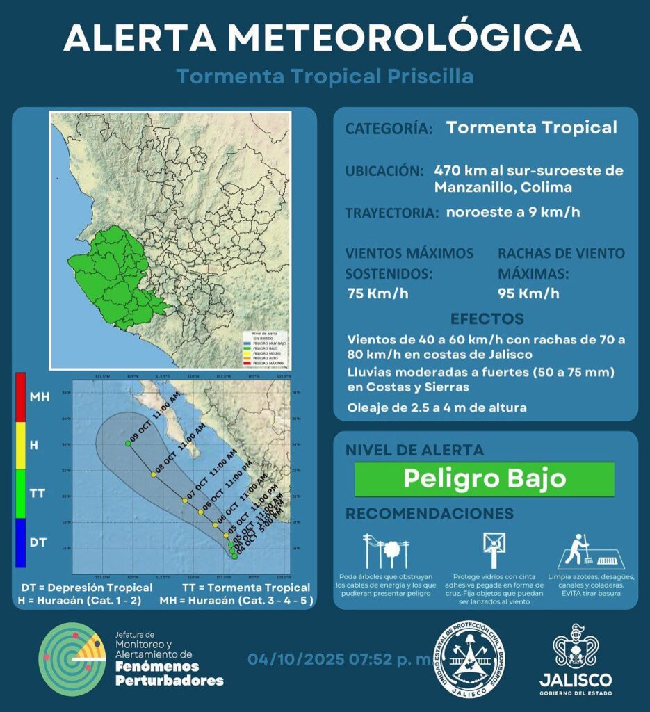 La Tormenta Tropical Priscilla se localiza a 470 kilómetros al sur-suroeste de Manzanillo, Colima, con vientos máximos sostenidos de 75 km/h y rachas de hasta 95 km/h, desplazándose hacia el noroeste a una velocidad de 9 km/h.
