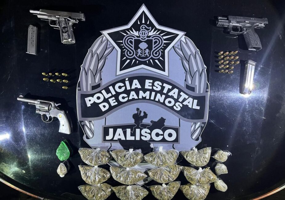 Elementos de la Policía Estatal de Caminos detuvieron luego de una persecución en Ojuelos a un hombre en presunta posesión de varias armas de fuego y aparente droga, a bordo de un vehículo con supuesto reporte de robo.