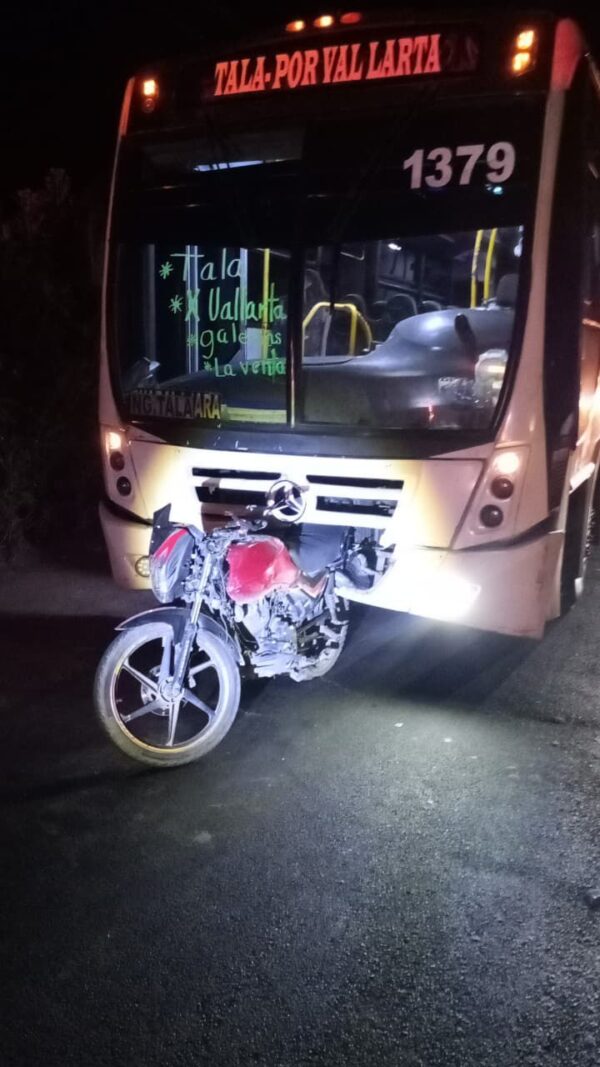 Choque entre un autobús y una motocicleta en la carretera Guadalajara–Ameca, a la altura de Los Chorros de Tala, deja dos personas lesionadas que fueron trasladadas al IMSS de Tala.
