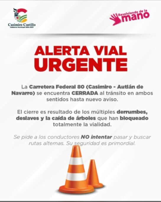 Cierre en la carretera federal 80, a la altura de La Calera en Casimiro Castillo, por deslaves causados por lluvias. Autoridades ya atienden la situación...
