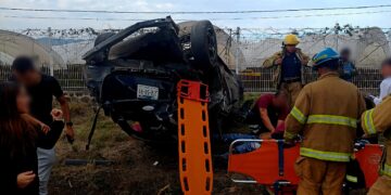 Dos personas, un adulto mayor y un menor, resultaron con lesiones leves tras la volcadura de un vehículo Razer en una brecha de La Calera...