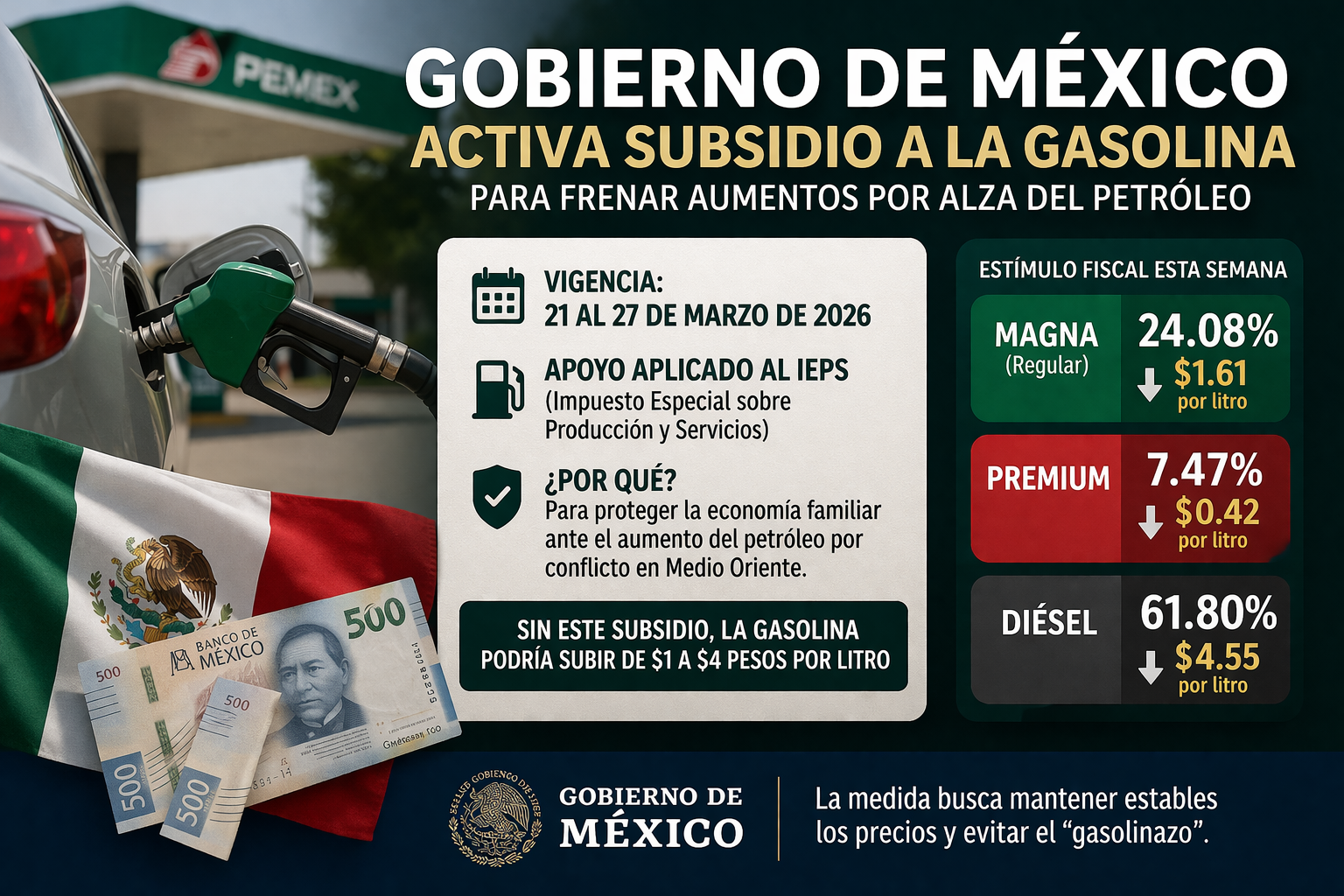 Subsidio a gasolina frena aumentos en México: activan apoyo del IEPS Published admin 22 marzo, 2026 Jalisco