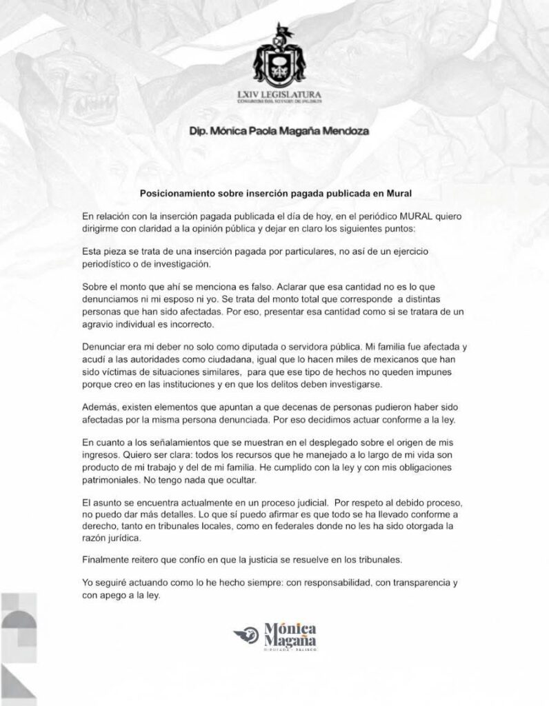 Un desplegado dirigido a la opinión pública y autoridades de Jalisco detonó un nuevo episodio de confrontación pública en torno a un proceso judicial que involucra a la diputada local Mónica Paola Magaña Mendoza y a su esposo, Sergio Salinas Escutia.