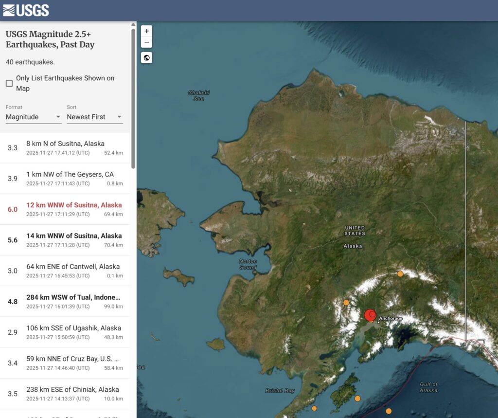 Un sismo de magnitud 6.0 sacudió el sur de Alaska este jueves, cerca de Susitna y a 38 millas de Anchorage. No se reportan daños ni víctimas, pero se sintió ampliamente en la región.
