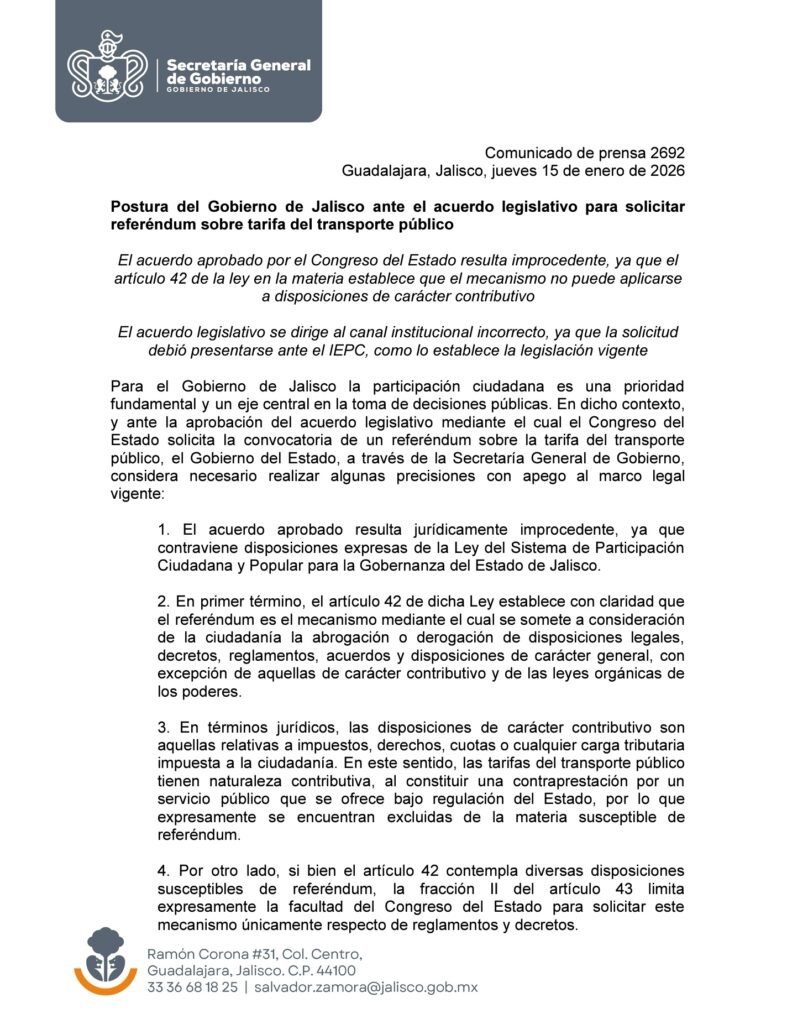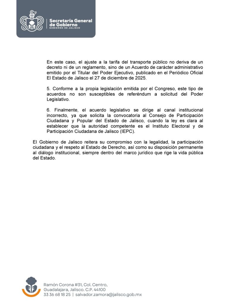 En respuesta, el Gobierno de Jalisco, a través de la Secretaría General de Gobierno, rechazó el acuerdo legislativo y sostuvo que el referéndum no es legalmente viable. El Ejecutivo argumentó que el ajuste tarifario no proviene de un decreto ni de un reglamento, sino de un acuerdo administrativo del Poder Ejecutivo publicado el 27 de diciembre de 2025 en el Periódico Oficial del Estado.