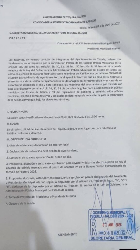 El municipio de Tequila se encuentra en un momento decisivo. El Ayuntamiento convocó a una Sesión Extraordinaria de Cabildo que podría derivar en un cambio inmediato en la presidencia municipal.
