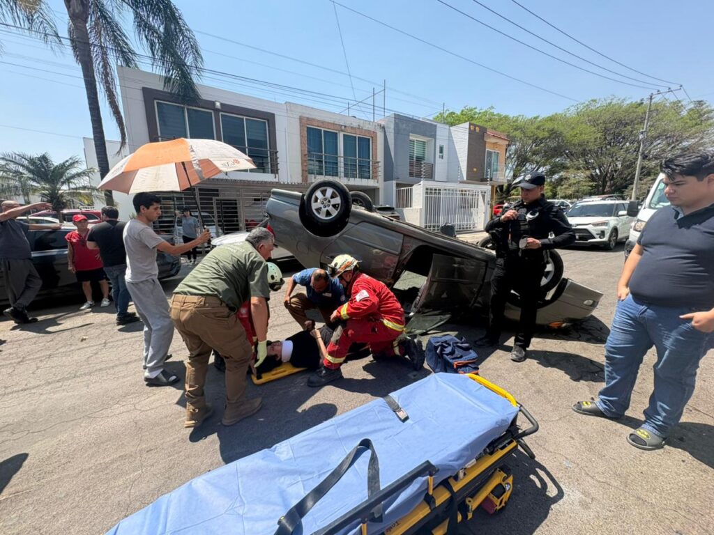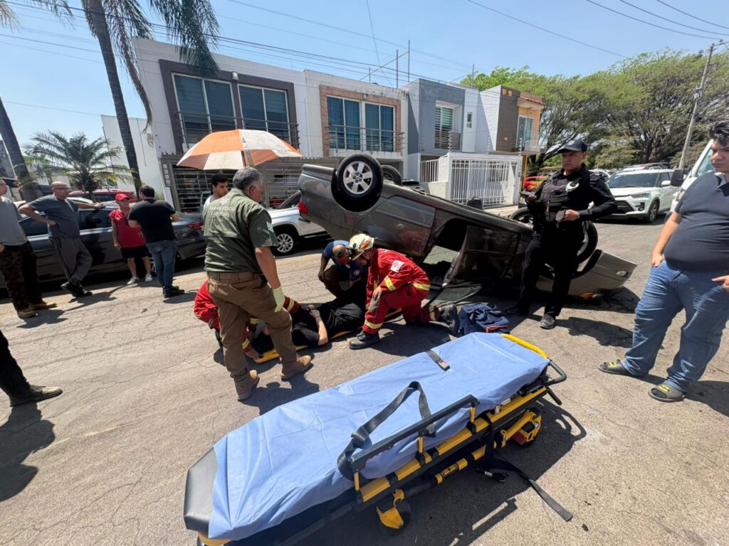 Volcadura en la colonia San Isidro, Zapopan, deja a una mujer de 32 años lesionada. Fue rescatada y trasladada a un puesto de socorro. Autoridades descartan riesgos en la zona.